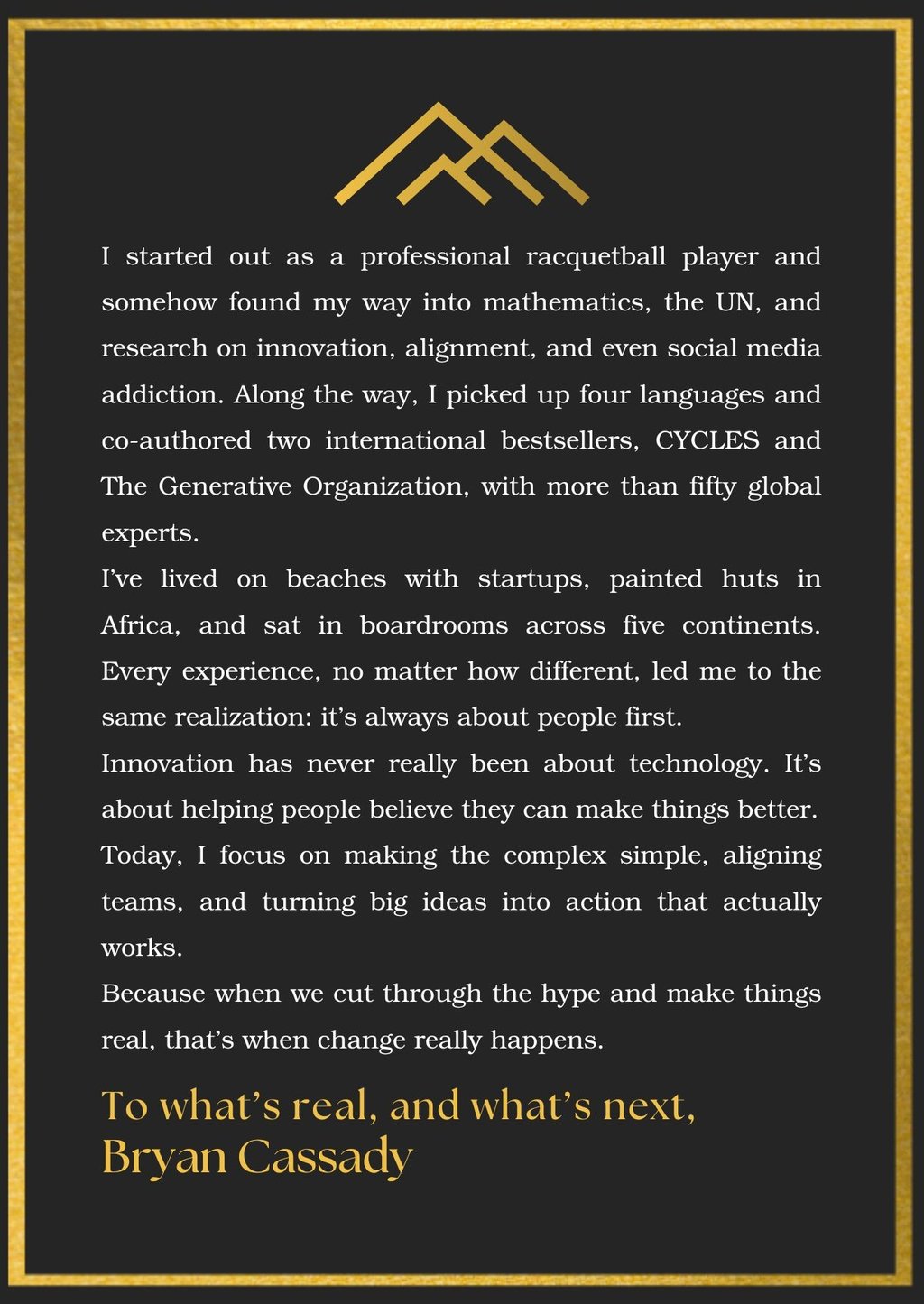 Bryan has lived on a beach with startups, painted huts in Africa, and sat in boardrooms on five continents. Wherever he goes, it’s people first: show up, do the work, keep your word.