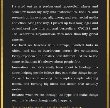 A researcher who has published on innovation, alignment, and social-media addiction. He’s co-created books with 50+ experts worldwide, including the international bestsellers CYCLES and The Generative Organization.